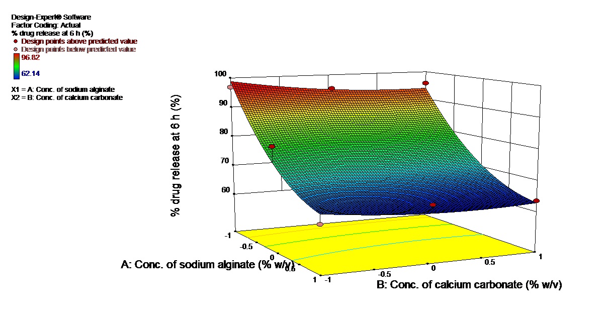 Fig. 3: 3-D Response surface plot showing the influence of sodium alginate and calcium carbonate concentration on the percent drug release at 6 h.
