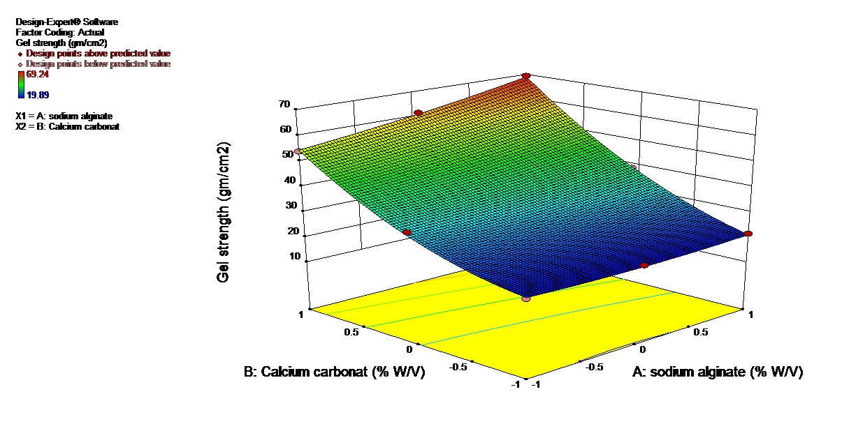 Fig. 4: 3-D Response surface plot showing the influence of sodium alginate and calcium carbonate concentration on the gel strength