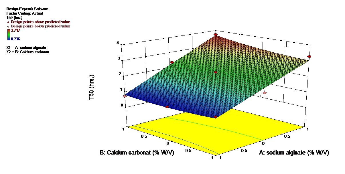 Fig. 5: 3-D Response surface plot showing the influence of sodium alginate and calcium carbonate concentration on T50%. time required to release 50% of loaded drug dose