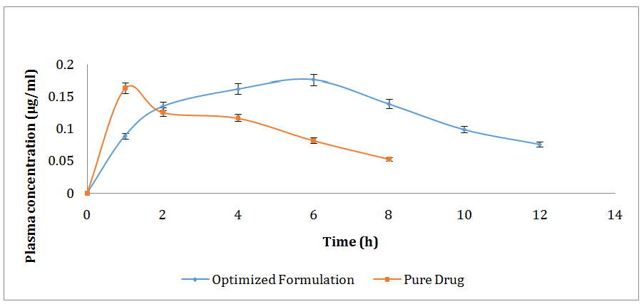 Male Wistar rats, weighing 230–330 g, were fasted for 24 h with free access to water. The rats were divided into three groups of six rats each, viz., first group served as negative control, second group was administered pure ITO solution and third group was administered optimized formulation (10mg/kg of animal weight). The rats were anaesthetized with the help of ether, and the retro-orbital method was used to removal of blood samples. Blood samples were withdrawn from the retro-orbital vein at intervals of 0, 1, 2, 4, 6, 8, 10, 12 h and analyzed by bioanalytical HPTLC method using a mixture of methanol- ammonium acetate (6:4, v/v) as mobile phase and detected at λ max of 288 nm [23, 24]. A simple protein precipitation method was employed for extraction of the drug from human plasma using 10% perchloric acid. The protocol for the animal experiment was approved by the Animal Ethical Committee ref no. (AISSMS/IAEC/13-14/01-28).