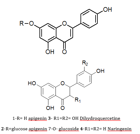 The 1H nmr spectrum was consistent with a flavanone structure and it exhibited a characteristic resonance of H-2` and 6` at = 7.30, d,J= 8.5,Hz and H-3`and 5`at δ= 6.78, d,J= 8.5,HZ H-8 and H-6 ( 5.86, s). The presence of signals 5.42 (H-2), 3.25 (H-3a) and 2.66 (H-3b) confirm the flavanone nature of this compound, so, these spectral data were in agreement with those reported for Naringenin [25].