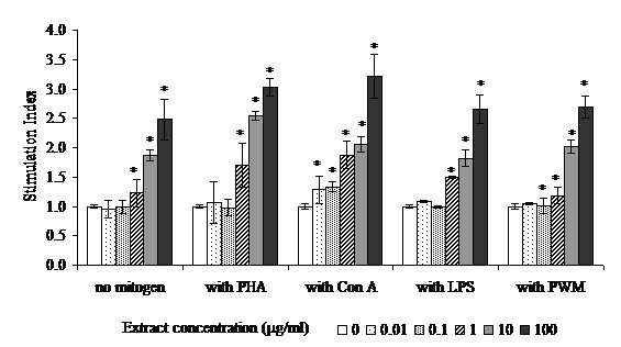 Fig. 1: Effects of T. bellerica acetone extract on in vitro proliferation response of mouse splenocytes without or with 5 µg/ml of a mitogen (PHA, con A, LPS and PWM). Each value represents the mean ±S. E. of triplicates compared to the control (0.1% DMSO in PBS solution) or mitogen alone; *P < 0.05.