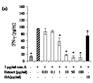Production of murine IFN-γ, IL-2 and IL-10 was measured by ELISA according to the instructions of the manufacturer (eBioscience, Inc. San Diego, USA). 5 µg/ml Con A-induced splenocytes were treated with the extract (0.01, 0.1, 1, 10, 50 and 100 µg/ml) or 10 µg/ml gallic acid for 48 h at 37°C in a humidified 5% CO2 incubator and the culture supernatants were analysed. Briefly, a 96-well microtiter plate was pre-coated overnight with capture antibody. Followed by blocking and several washings, working standards and samples were then added for incubation for 2 h. After further washing, the working detector solution containing biotinylated anti-mouse cytokine monoclonal antibody and avidin-horseradish peroxidase conjugate was added to each well and incubated for 1 h. The substrate solution was then added for incubation, followed by the addition of stop solution, and the absorbance was read within 30 min using a microtiter plate reader at 450 nm.