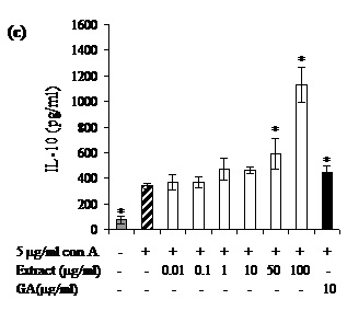 Fig. 2: Effects of T. bellerica acetone extract on production of (a) IFN−γ; (b) IL-2 and (c) IL-10 response of mouse lymphocytes with the induction of 5 µg/ml con A, using 10 µg/ml gallic acid (GA) as reference substance. Each value represents the mean ± S. E. of quadruplicates comparing to con A; *P <0.05.