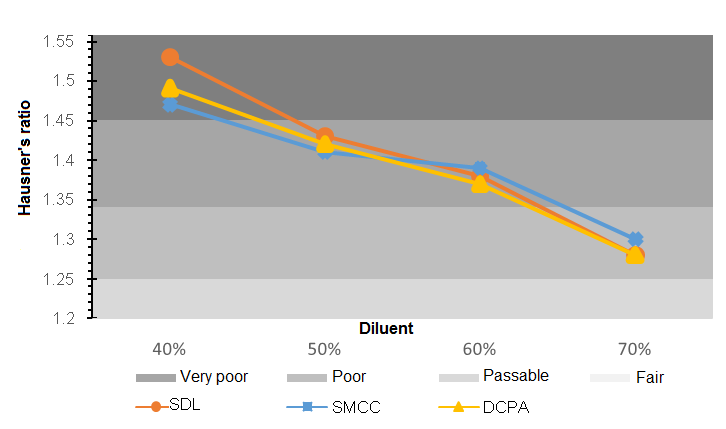 However, at the diluent ratios of 60% and 70%, the investigated mixtures contained SDL or DCPA gave the lower Hausner’s ratios and thus better flowability compared with the investigated mixture contained SMCC. It could be explained by the almost spherical shapes and the higher densities of SDL (d=0.71 g/ml) and DCPA (d = 0.82 g/ml). As a result, different mechanisms of flowability enhancement such as the optimized shape, density and size of particles should be employed for improving the flowability of the active ingredients.