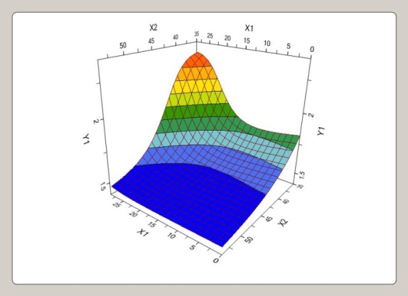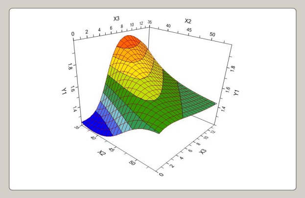 The three-dimensional (3D) response surface plots of the fit models were depicted for better understanding of the cause-effect relationships between the independent and dependent variables. Each 3D diagram illustrated the effects of two independent variables on the dependent variables at one time while the third variable was kept constant.