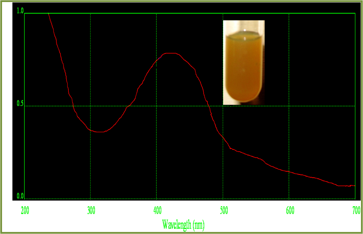 To further strengthen the evidence that the biofabrication of AgNPs was carried out using ALM, UV–Vis spectral analysis was carried in the range of 300– 800 nm to see the appearance of specific SPR peak of AgNPs. The spectrum showed SPR peak between 380-450 nm and confirmed the synthesis of AgNPs from ALM (Fig 1)