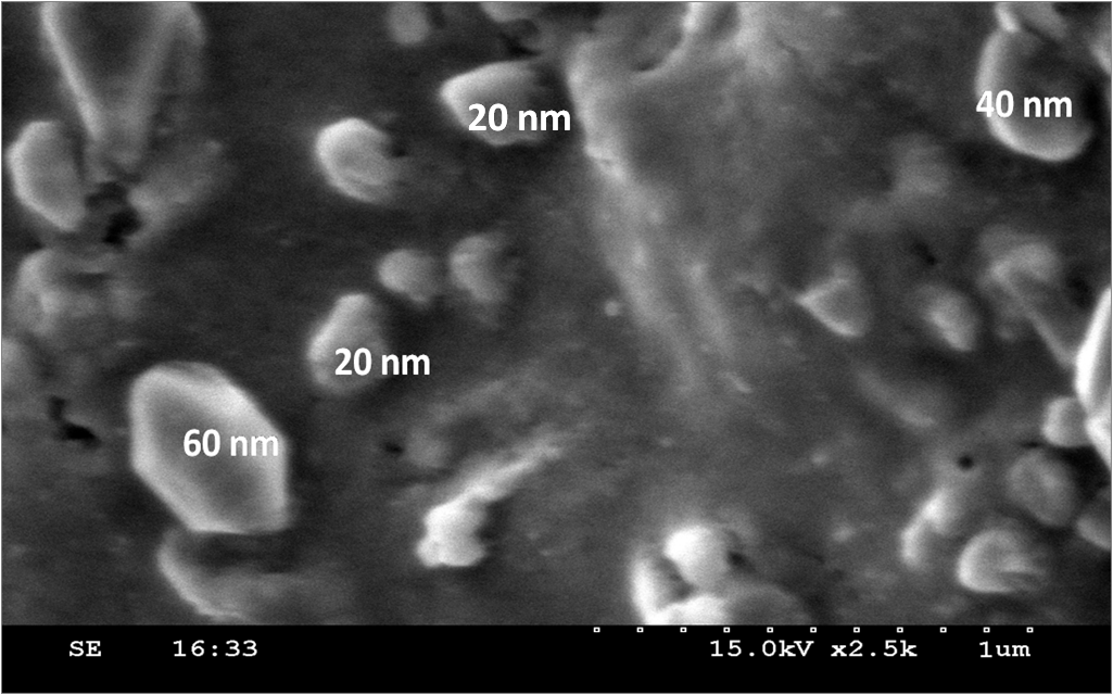 To confirm the morphology and size of the bio-fabricated AgNPs, SEM analysis was performed. An aliquot of the suspension of AgNPs was taken on a clean glass slide and evaporated to dryness. SEM analysis was done at 15 kV with magnification X 2.5 k, followed by EDX spectroscopy to confirm elemental silver (SEM Hitachi- S520).