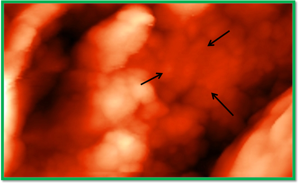 Fig. 3: AFM micrograph showing the topography of the AgNPs synthesized from ALM. (Arrows indicates roughly spherical shaped AgNPs with 20-40 nm* in size)