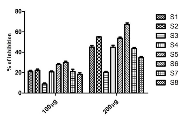 The sap/phloem exudates from plants by incision with a sharp needle and oozing exudates were collected in a sterile tube containing cold 10 mmol phosphate buffer saline (PBS) and immediately transferred to a freezer at-20 °C. Later the samples were removed from the freezer and centrifuged at 12,000 rpm for 15 min. clear supernatant was transferred to a fresh tube and repeat the same procedure until getting a clear solution. The sample free from the debris was subjected to lyophilization, used for the further assay. The samples were named as follows, Cucumis dipsauses (S1-), Lagenaria siceraria (S2), Brassica oleracea gongylodes (S3), Abelmoschus esculentus (S4), Cucumis prophetarum (S5), Praecitrullus fistulosus (S6), Averrhoa carambola (S7) and Actinidia deliciosa (S8).