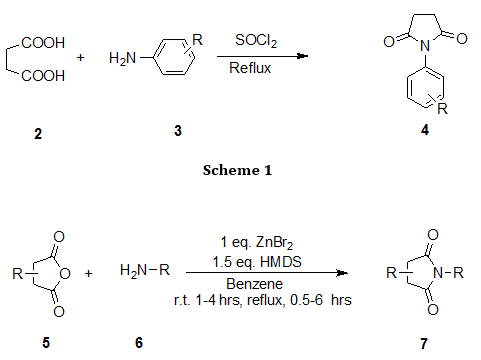 The convenient method was reported for the direct synthesis of substituted succinimides in which succinic anhydride 5 treated with amine 6 using Lewis acid catalyst in the presence of Hexamethyl disilazane (HMDS) in benzene afforded the substituted succinimides 7 (Scheme 2) [17].