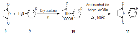 Reactions were studied and reported the synthesis in mild condition in which succinic anhydride 8 condensed with substituted aromatic amines 9 gives imic acid intermediate 10, which on cyclization with the help of acetic anhydride in anhydrous sodium acetate at 1000C gives N-phenyl succinimides 11 (Scheme 3) [18].