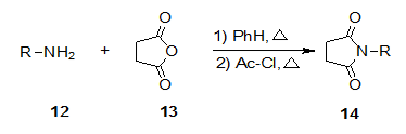 Treatment of amines 12 with succinic anhydride in the presence of benzene using acetyl chloride as dehydrating agent furnished succinimides 14 (Scheme 4) [19].