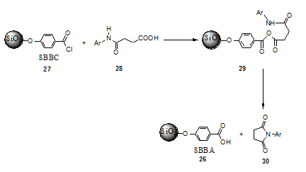 A new method upon adopting a solid-phase strategy for the synthesis of N-aryl succinimides 30 was described using the silica-bound benzoyl chloride (SBBC) 27 (Scheme 7) as dehydrating agent in reaction with N-arylsuccinamic acids 28 (Scheme 8) [22]. The main advantage of this method is the recyclability of SBBC.