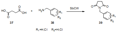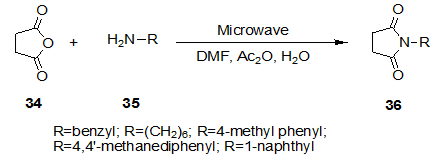 Microwave-assisted preparation of substituted succinimide 36 was performed by reacting succinic anhydrides 34 and amine 35. The reaction was carried out in solvent DMF, acetic anhydride or water. The yield reported by microwave assisted reaction was excellent as compared to conventional method. (Scheme 10) [24].