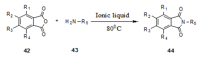 N-alkyl and N-arylimides 44 were synthesized from cyclic imides 42 and alkyl or aryl amine 43 efficiently under mild reaction conditions in the presence of ionic liquids. The use of ionic liquids offer improvements for the synthesis of cyclic imides with regard to the yield of products, simplicity in operation, short reaction times and green aspects by avoiding toxic catalyst and organic solvents (Scheme 13) [26].