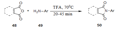 A mixture of anhydride 48 and aromatic amine 49 in trifluoroacetic acid as reaction medium and promoter was refluxed at 700C for appropriate time to obtain succinimides 50 (Scheme 15) [28].