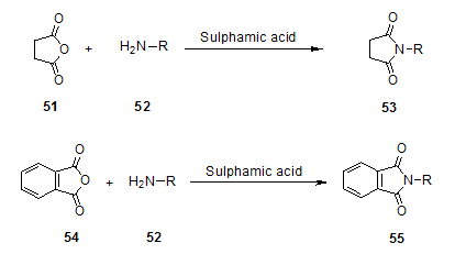 One pot method was reported for the synthesis of succinimides 53 by reacting succinic anhydride 51 in situ with aromatic or aliphatic amines 52 using 10 % sulphamic acid as a catalyst (Scheme 16) [29].