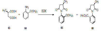 A novel approach of asymmetric deprotonation strategy to the synthesis of chiral succinimides results atroposomeric imides 65 and 66 was reported, starting from (R)-2-methyl succinic acid 63 and orthoisobutylaniline using 1-Ethyl-3-(3-dimethylaminopropyl) carbodiimide (EDC) (Scheme 19) [32].
