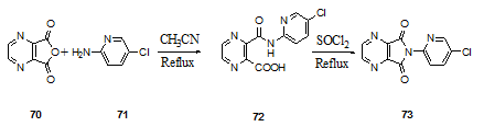 The treatment of pyrazine anhydride 70 with 2-amino-5-chloropyridine 71 gave amide 73 in good yield (Scheme 21) [34].