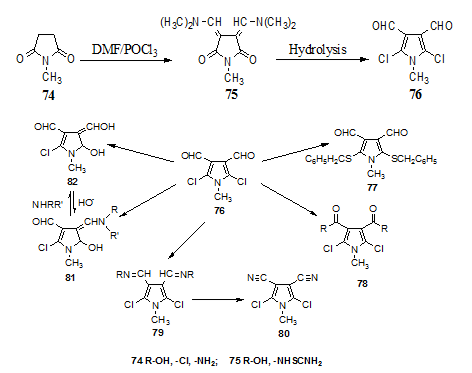 N-alkyl substituted succinimide 74 underwent dichloro diformylation in the presence of dimethylformamide and phosphorus oxycloride leads to aromatization of ring and formation of N-substituted dichlorodiformylpyrroles 76 via intermediate 75, which was used as synthone for the preparation of derivatives 77-82 (Scheme 22) [35].