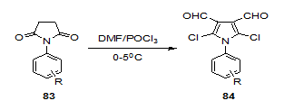 Halovinyl aldehyde derivative, N-phenyl-2,5-dichloro-3,4-diformyl succinimide 84 was obtained by successive reaction of 83 with Vilsmeier-Haack reagent (DMF/POCl3) at 0-50C (Scheme 23) [36].