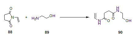 When both amino and hydroxyl groups are present in the same nucleophile, the amino group reacts selectively with succinimide. Thus N-vinyl succinimide 88 and ethanolamine 89 produce diamide 90 in almost quantitative yield at room temperature (Scheme 25) [38].