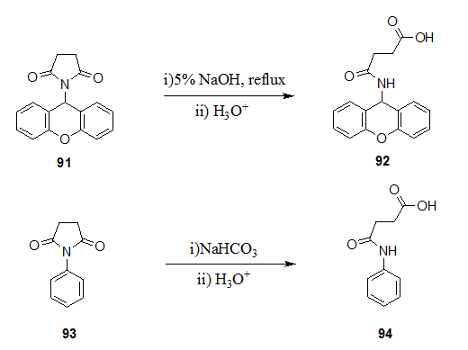 In contrast to ordinary amides, succinimides 91 and 93 were hydrolyzed to carboxylic acids 92 and 94 under weakly basic condition (Scheme 26) [39].