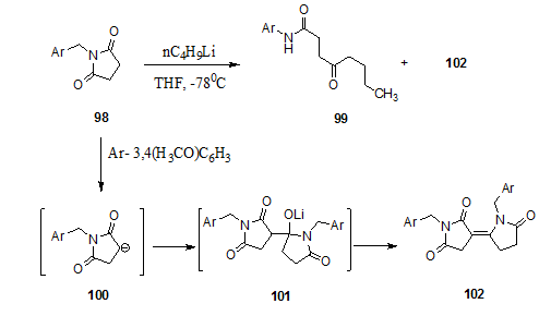 Reaction between succinimide and lithium reagent produce low yield of ketones (e. g. 98→99, Scheme 28). Since lithium reagents act as strong base, abstract one proton from the succinimide to formimic enolate 100, which then undergoes intermolecular nucleophilic addition to another molecule of succinimide to produce dimeric product (Scheme 28) [41].
