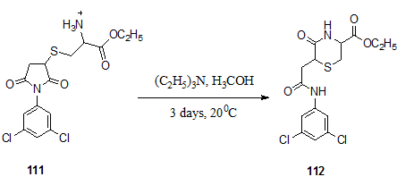 When succinimide 111 is reacting with the amino group, it forms preferentially a six member ring product 112 (Scheme 31) [44].