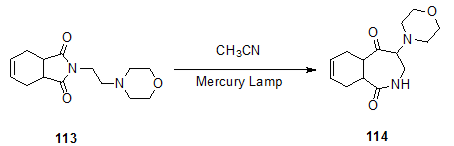 Succinimide can undergo ring opening and intramolecular cyclization under photochemical conditions. When compound 113 was irradiated in the presence of methyl Nitrile, a product 114 was obtained (Scheme 32) [45].