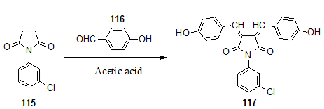 Bis chalcone 117 was obtained by reaction of N-(3-chlorophenyl) succinimide 115 and 4-hydroxy benzaldehyde 116 using glacial acetic acid. The bis chalcone separate as colored crystals (Scheme 33) [46].