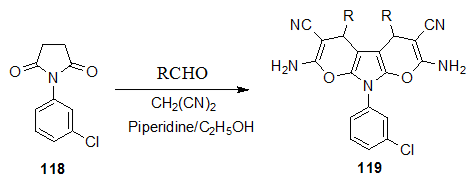 A mixture of N-(3-chlorophenyl) succinimide 118 refluxed with aldehyde in the presence of malononitrile in piperidine/ethanol for 4-5 hrs give azo flurorene 119 (Scheme 34) [47].
