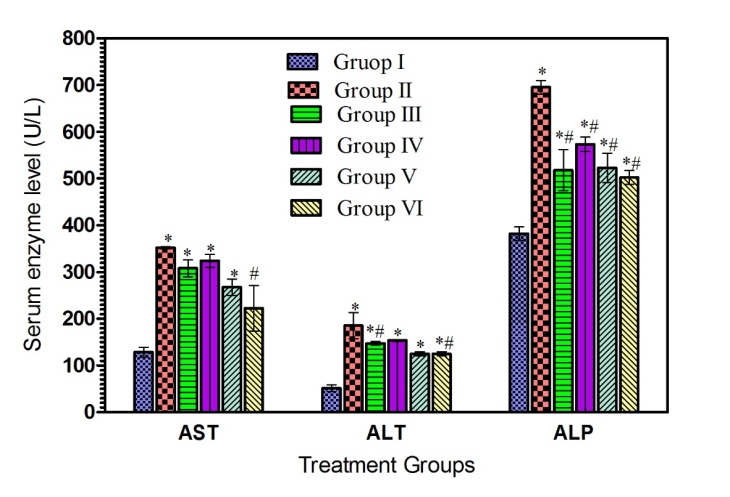 Fig. 1: Effect of ESBG on serum AST, ALT and ALP levels, Group I = Normal control (1 ml/kg b.w. n-saline); Group II = CCl4 (2 ml/kg b.w.); Group III = CCl4+100 mg/kg b.w. Silymarin; Group IV = CCl4+100 mg/kg b. w ESBG; Group V = CCl4+300 mg/kg b.w. ESBG; Group VI = CCl4+900 mg/kg b.w. ESBG; *p<0.05 = significantly different compared to Group I (normal control); #p<0.05 = significantly different compared to Group II; data presented are the means±SEM; n = 6