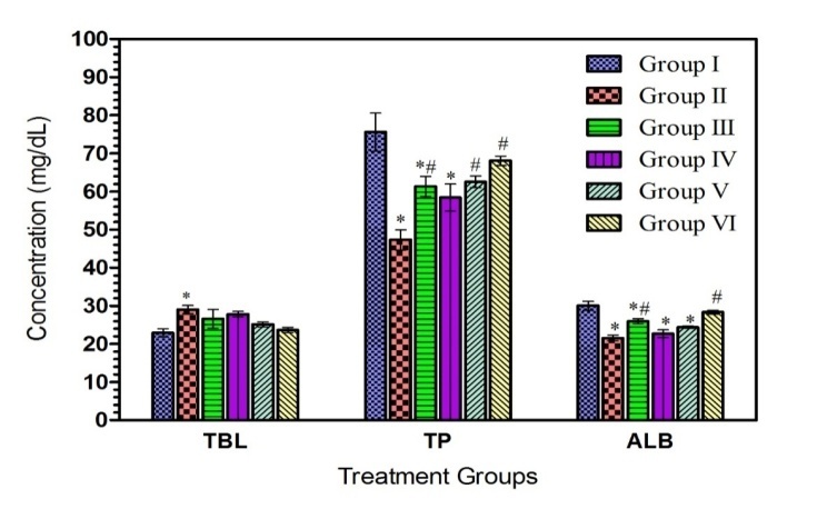Fig. 2: Effect of ESBG on serum TBL, TP and ALB levels, Group I = Normal control (1 ml/kg b.w. n-saline); Group II = CCl4 (2 ml/kg b.w.); Group III = CCl4+100 mg/kg b.w. Silymarin; Group IV = CCl4+100 mg/kg b. w ESBG; Group V = CCl4+300 mg/kg b.w. ESBG; Group VI = CCl4+900 mg/kg b.w. ESBG; *p<0.05 = significantly different compared to Group I (normal control); #p<0.05 = significantly different compared to Group II; data presented are the means±SEM; n = 6