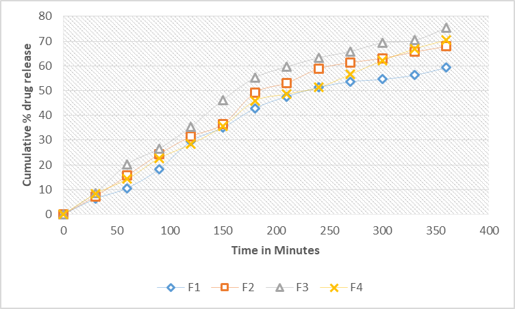 Fig. 6: Drug release profile of DST loaded SLNs for formulations from F1 to F4 (n=3; mean±SD)