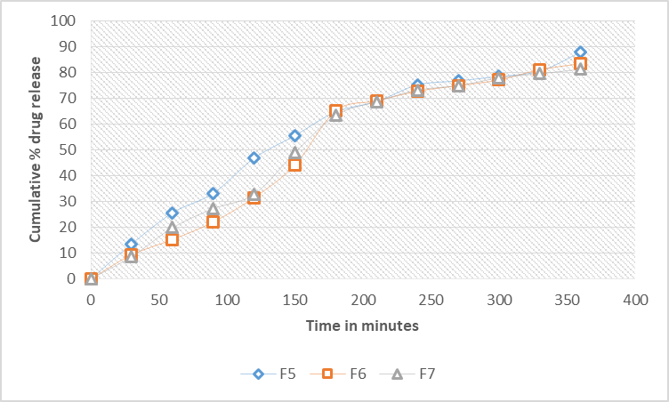 Fig. 7: Drug release profile of DST loaded SLNs for formulations from F5 to F7 (n=3; mean±SD)