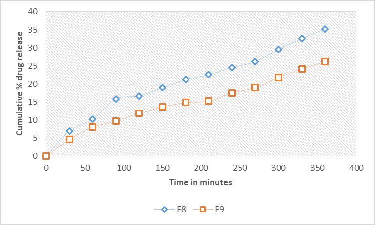 Fig. 8: Drug release profile of DST loaded SLNs for formulations F8 and F9 (n=3; mean±SD)