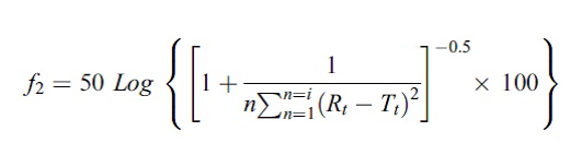 Where n is the number of pull points, Rt is the reference profile at time point t, and Tt is the test profile at the same time point; the value of f2 should be between 50 and 100. An f2 value of 100 suggests that the test and reference profiles are identical and, as the value becomes smaller, the dissimilarity between release profiles increases.