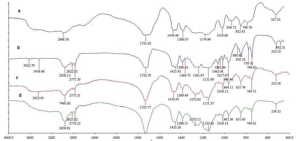 Fig. 1: FT IR spectrum of EL (a), EE (b), physical mixture (c) and heat treated polymer mixture (PPM) (d).
