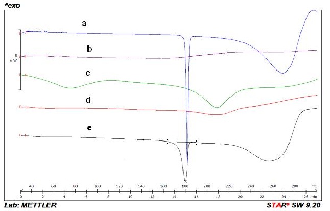 Fig. 2: DSC spectrum of tramadol (a), EE (b), EL (c), PPM (d) and physical mixture of tramadol and PPM (e)
