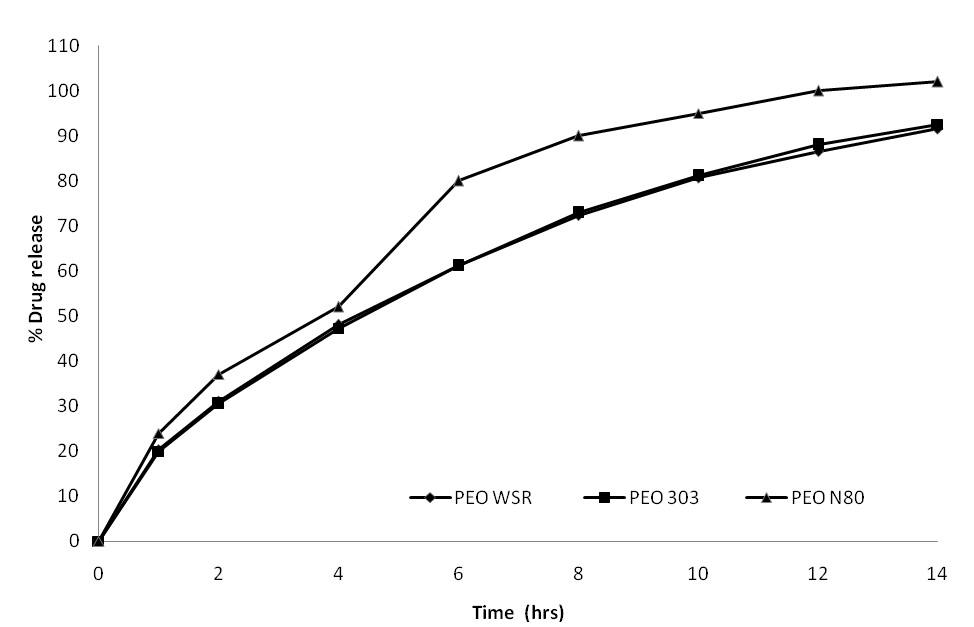 PEO is a hydrocolloid gelling agent. Upon contact with gastric fluid, PEO takes up water and when water penetrates the matrix, the polymer chains become hydrated and these eventually disentangle from the matrix. At high polymer concentrations, the linear polymer chains entangle to form what may be considered ‘virtual cross-linking’ which eventually erodes, resulting in drug liberation. However, the rate of polymer erosion is dependent on the viscosity of the PEO grade that is used in the formulation. PEO WSR 303 has a high molecular weight and is of high viscosity grade, it is relatively resistant to polymer erosion compared to the low molecular weight and low viscosity grades [41]. The effect of viscosity of PEO on the drug release was evaluated and shown in figure. 5. The concentration of each type of PEO (Polyox WSR N80 (F9), Polyox WSR coagulant (F8) and Polyox WSR 303(F4)) was set at a fixed quantity of 200 mg/tablet. As the viscosity of PEO was increased from WSR N80 to WSR coagulant, the release rate was decreased. Drug release at 12 h in these formulations was 100% and 87% respectively. The drug release was fastest in PEO WSR N80 formulation with a K value of 23.55% h−0.641 and t50% value of 3.24 h. The drug release was slowest in PEO WSR 303 formulation with a K value of 20.28% h −0.616 and t50% value of 4.33 h. This observation was agreed with other reports [41]. The release rate was faster with lower viscosity grades of PEO, probably owing to less polymer entanglement and less gel strength. As it clear from the figure 5, there is no difference in the drug release profile between formulations containing Polyox WSR coagulant and Polyox WSR 303 grades (f2 = 97).