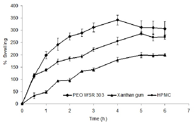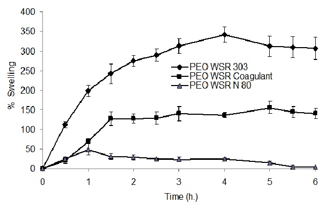 The swelling behavior of various polymer blends was analyzed to compare their water uptake capacity. The rate of swelling for matrix tablets that contained different PEO grades is shown in figure 6. Swelling of the matrix, which is indicated by the transition of the polymer from the glassy to the rubbery state, is an important parameter in the determination of the release characteristics of the matrix system [42]. The correlation of polymer swelling to drug release can help explain why different polymer blends gave different mechanisms of release. Fig.6 showed that matrices which contained high molecular weight PEO showed significant swelling over time (P<0.05). The highest degree of hydration was achieved by the Polyox WSR 303 tablet. There was about 300% weight gain at the end of 6 h due to swelling in these matrices. On the other hand, formulation containing low molecular weight Polyox WSR coagulant was hydrated to a much lower extent compared to Polyox WSR 303 matrix tablets. These matrices could hydrate only up to 5 h after which there was no further increase in the tablet weight due to water uptake. For the Polyox WSR N80 matrix, low swelling and erosion of the matrix tablet was observed after 5 h.