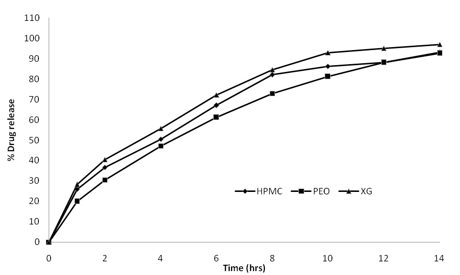 Fig. 7: Comparative dissolution profile of tramadol floating matrix tablet prepared with different hydrophilic polymer types. Each data point represents the average of 3 tablets from three batches with SD within ±3.0.