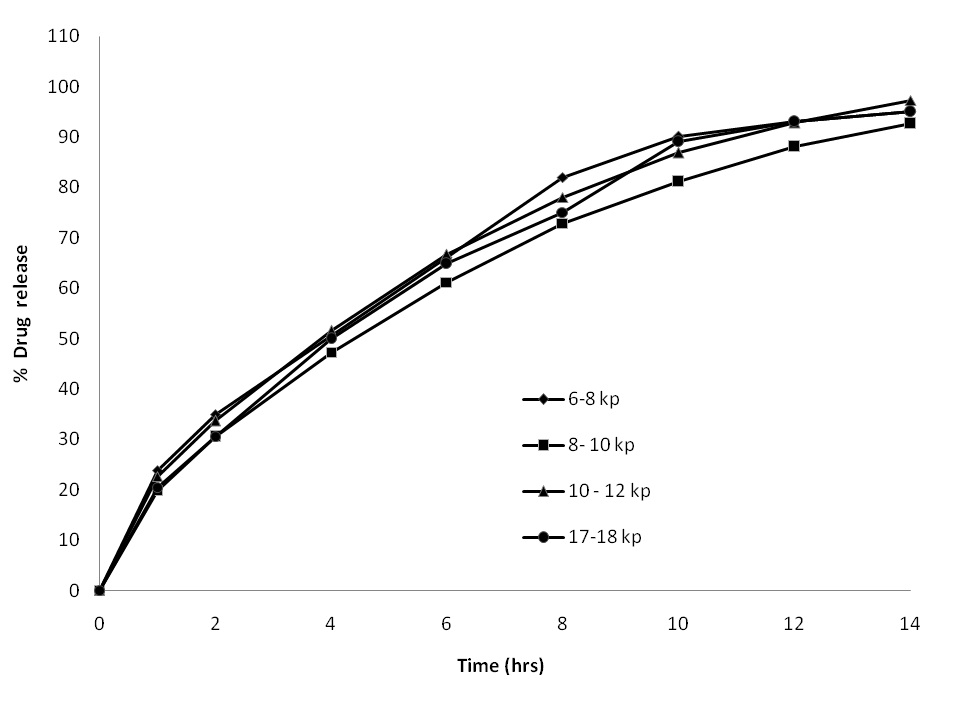 The effect of tablet hardness on the drug release was studied by preparing tablets using same type of polymer and same polymer proportion but with different hardness levels, 6–8, 8–10, 10-12 and 17–18 kp. As shown in figure 9, the release of the drug from formulations compressed at different hardness levels were found to be similar based on similarity factor. The f2 values determined by comparing drug release profiles of 8-10 kp with 6-8 kp, 10-12 kp and 17-18 kp was found to be 60, 66.5 and 70.1 respectively. The tablets compressed at hardness levels beyond 12 kp was found to be non floating and indicated that the tablet density may be higher than 1.0mg/mm3. Tablets compacted at a hardness level of less than 12 kp, keep more entrapped air, decreasing the agglomerate density and allowing the tablets floating. On the other hand, tablets compacted at higher pressure are less porous and display a density not allowing the matrices floatation.