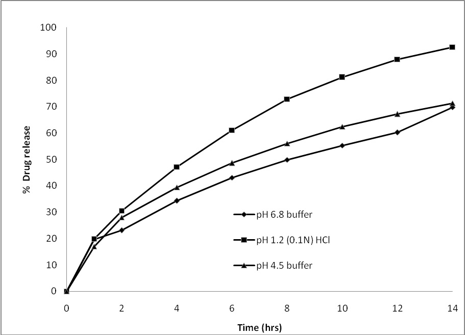 The investigation of the effect of various dissolution media on the release profile of drug from the dosage form is important because the dosage form will encounter environments of differing pH during its transit in the gastrointestinal tract. The effect of dissolution media (pH 1.2, 4.5 and 6.8) on the drug release from selected formulation (F4) are shown in Fig. 10. The f2 values determined by comparing drug release profiles in pH 1.2 with pH 6.8, pH 4.5 with pH 6.8 and pH 1.2 with pH 4.5 were found to be 38.4, 62.9 and 46.0 respectively for the selected formulation (F4); The drug release was fastest in pH 1.2 with a K value of 19.815% h−0.626 and t50% value of 4.39 h. The drug release was slowest in pH 4.5 and pH 6.8 buffer with a K value of 17.906% h −0.553 and 18.24 % h−0.489, t50% value of 6.4 h and 8.4 h respectively. The values of n for the selected formulation (F4) in pH 1.2, 4.5 and 6.8 were found to be 0.626, 0.553 and 0.475 respectively, indicating that the mechanism of drug release from the formulations across the pH range of 1.2 - 6.8 was found to be similar and follows non-ficikian or anomalous diffusion mechanism