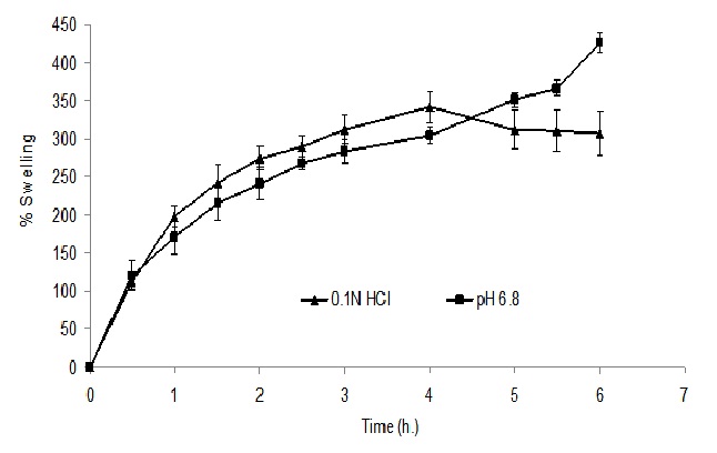 The swelling of the polymers upon hydration by the test medium was determined by a method similar to the equilibrium weight gain method as reported earlier. The matrix tablets were weighed and placed in tared metallic baskets. These baskets were then immersed in 900 ml of pH 1.2 or pH 6.8 phosphate buffer medium, at 100 rpm and 37± 0.5°C (USP 25 basket method).