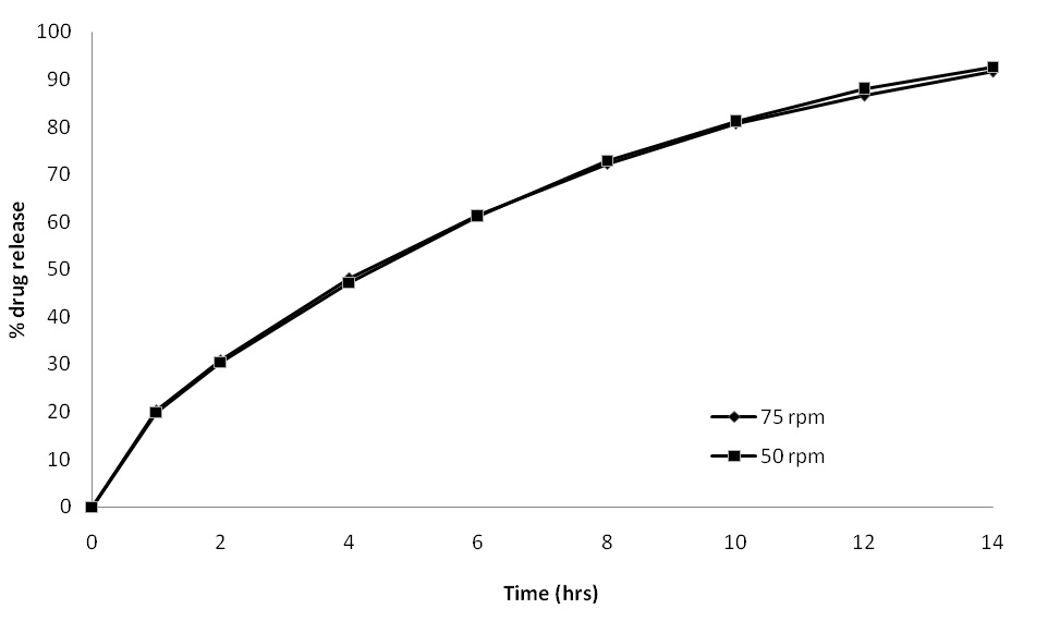 It is known that the drug release rate from the delivery system shall be influenced by the factors that influence dissolution such as the thickness of the diffusion boundary layer if it is controlled by the dissolution of drug. The aqueous diffusion boundary layer around the matrix offers significant resistance to the dissolution of poorly soluble drug. The thickness of the aqueous diffusion boundary layer is affected by the rate of agitation speeds in the dissolution medium: the higher the agitation rate, the thinner the aqueous diffusion boundary layer [44]. If the release of tramadol is solely controlled by its dissolution in the release medium, then increasing the agitation rate should accelerate the release of tramadol. The effect of agitation speed on the in vitro release profiles of drug from selected formulation (F4) in 900 ml of pH 1.2 (0.1N HCl) is shown in figure 12. No significant difference was observed in the release rate with increase in agitation speed from 50 rpm to 75 rpm as indicated by the f2 value (f2>97). MDT and t50% values are found to be similar for both the agitation speed (MDT of 4.7h and t 50 % of 4.39h for 50 rpm and MDT of 4.7h and t50% of 4.33 h for 75 rpm).