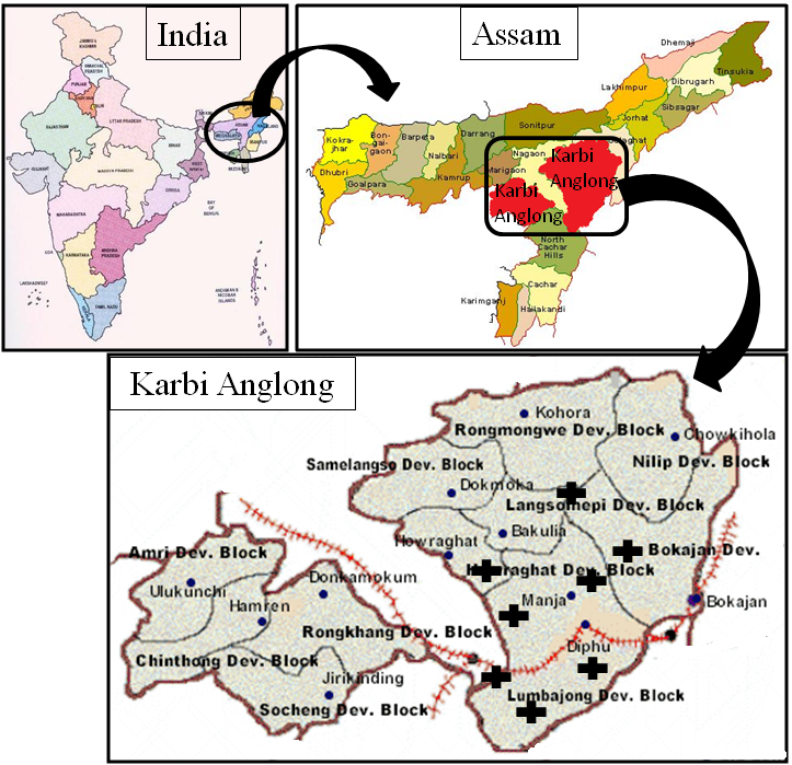 Fig. 2: Maps of India, Assam and Karbi Anglong showing the sites of field survey (thick plus marks)