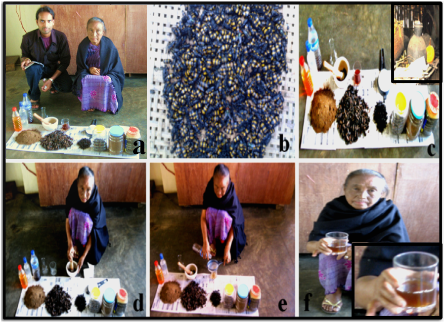 Fig. 3: Photograph capture during field survey showing traditional methods of drug preparation by the local Karbi tribal lady with one of the authors (AKV). (a) Data collection from traditional healer; (b) dry blister beetles Mylabris cichorii; (c) showing different animal products used for traditional practices; (d) grinding of animal product for drug preparation; (e) filtering of animals extract and (f) final extract ready for consumption